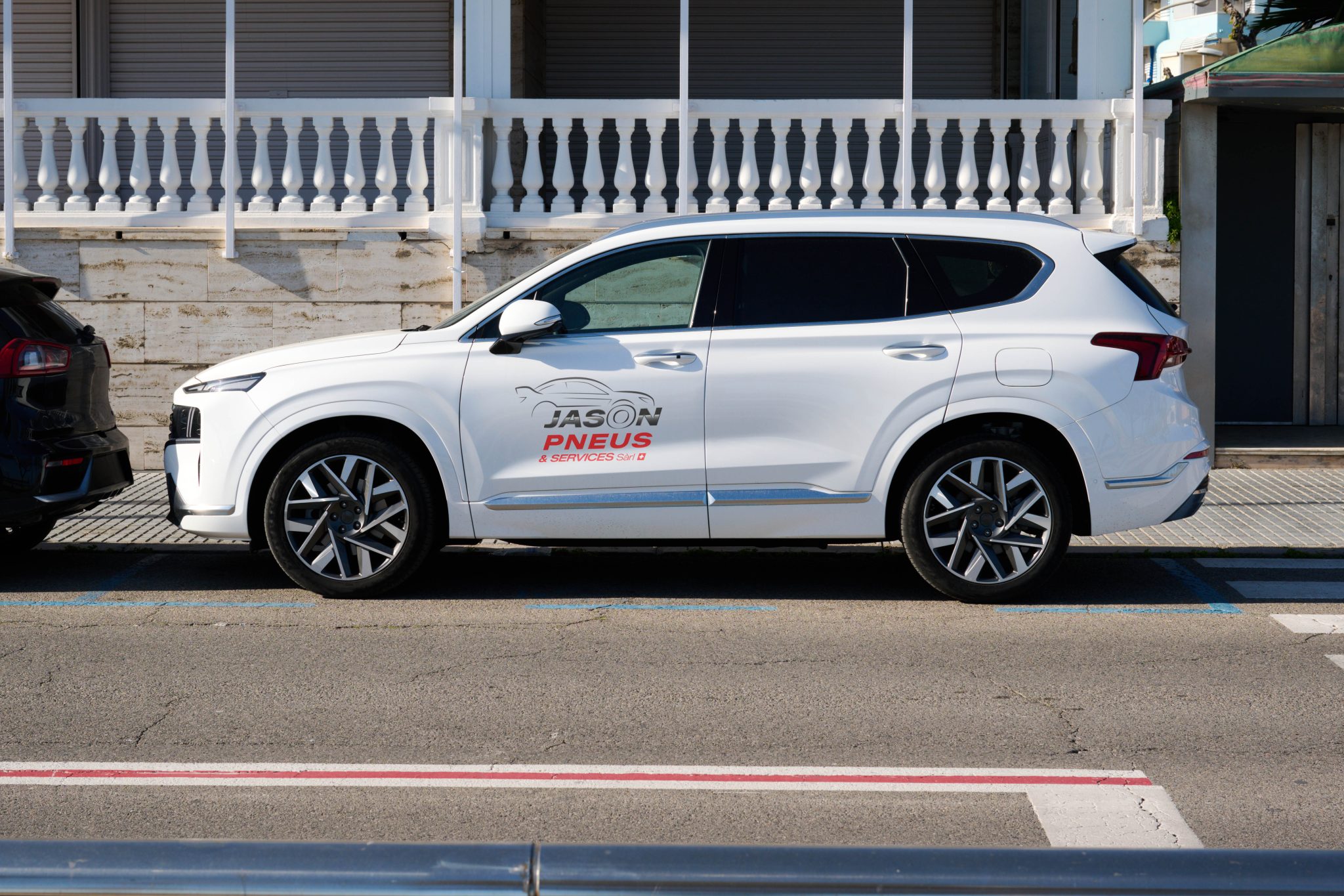 Le concept graphique intègre un élément fort : le “O” de “Jason” dessine un pneu, en lien direct avec son activité. L’ensemble est complété par une silhouette de voiture, affirmant clairement son domaine d’expertise.